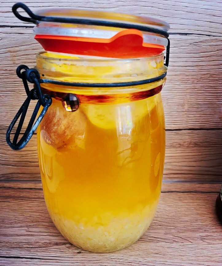 Dans le bocal en verre, mettre les grains de kéfir et ajouter tous les ingrédients en finissant par l’eau minérale.