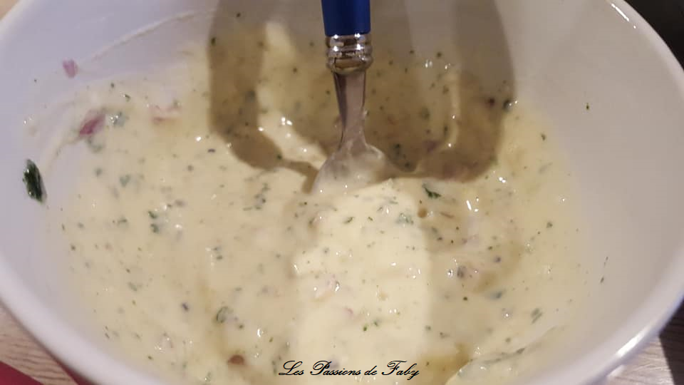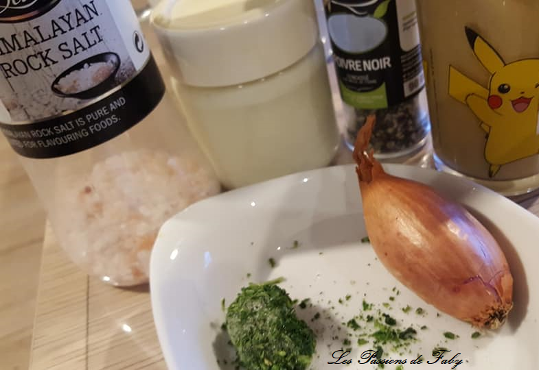 Emincer les échalotes après les avoir épluchées et mélangées au persil ( haché et congelé de l’été dernier). Rajouter au yaourt.