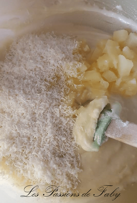 DĂ©couper les rondelles d’ananas en petits morceaux, l’ajouter Ă la prĂ©paration ainsi que la noix de coco. Bien mĂ©langer.