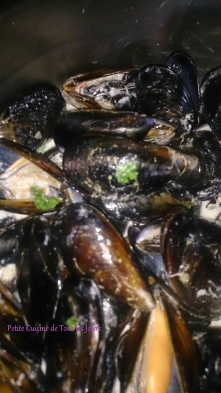 Je n’aime pas les moules, enfin si, si elles sont petites dans la paëlla ou sur une pizza à la rigueur. Mais ici, mes gourmands adorent ça.