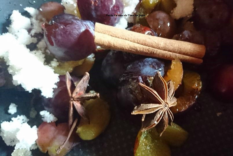 La prune j’aime la marier à la cannelle, mais là je ne sais pas pourquoi j’ai voulu rajouter d’autres épices. j’ai d’abord longuement hésité avec la cardamome, puis je me suis dis que la cannelle allait bien avec la badiane puisqu’il y en avait dans le vin chaud. Et avec la prune…