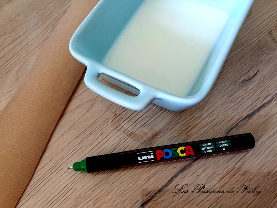 Tu écris au marqueur le libellé adéquat, tu coupes un morceau de papier Kraft, tu trempes le verso (le côté le plus mat) légèrement dans le lait et tu appliques sur ton pot. Le lait sert de colle. Voilà c’est tout simple.