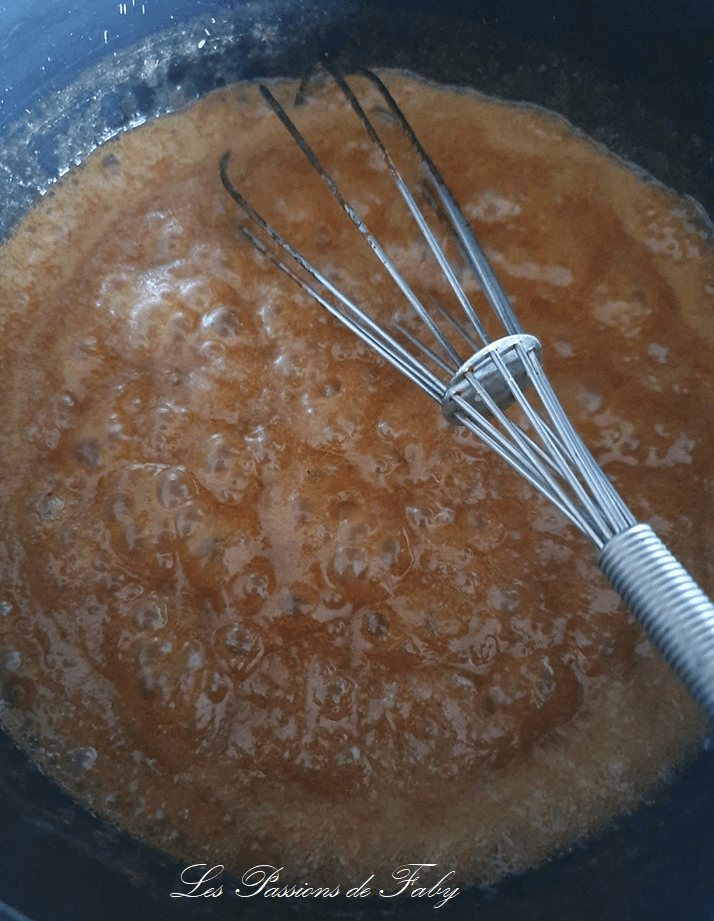 Remuer sur feu doux jusqu’à ce que le mélange soit bien homogène (le caramel aura tendance à former des morceaux qui vont fondre à cette étape)