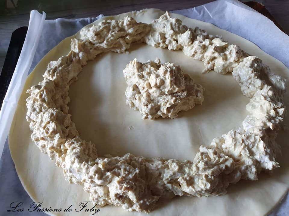 Former un dôme au centre de la pâte puis un cercle tout autour comme sur la photo en prenant soin de laisser au moins 2 cm de pâte sur les bords.