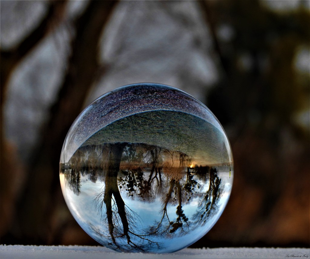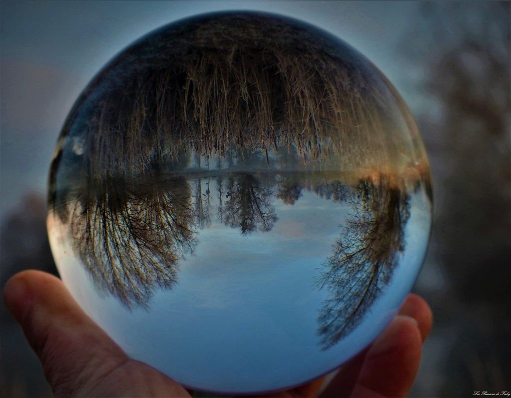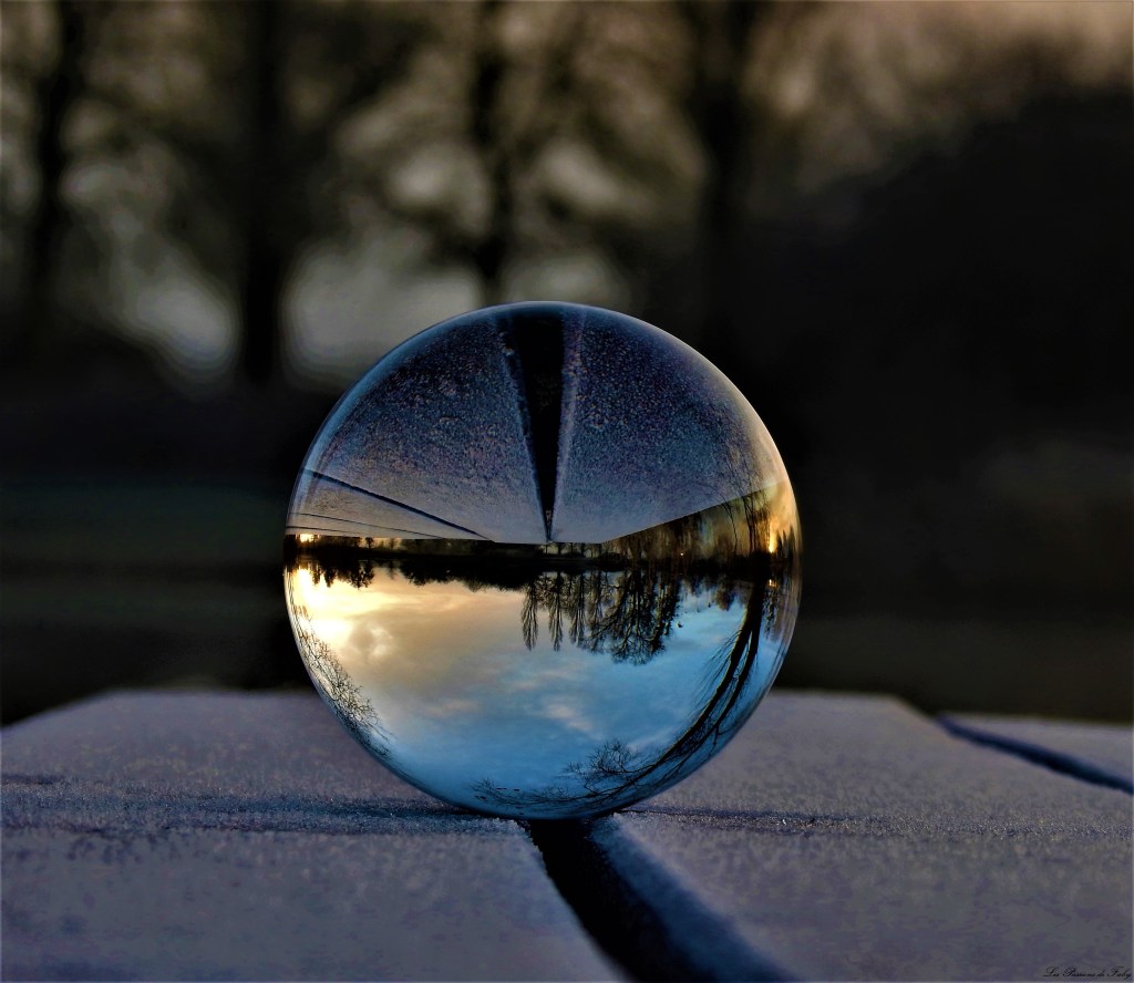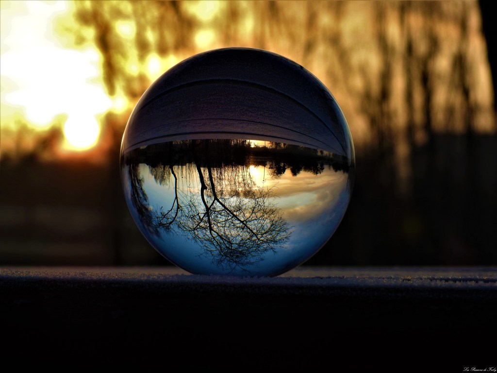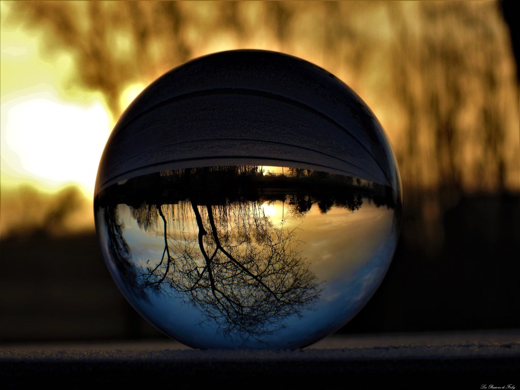 En me levant ce matin, j’ai vu qu’il avait gelé, c’était l’occasion de regarder le lever du soleil pas loin de l’étang et d’utiliser de nouveau ma Lensball.