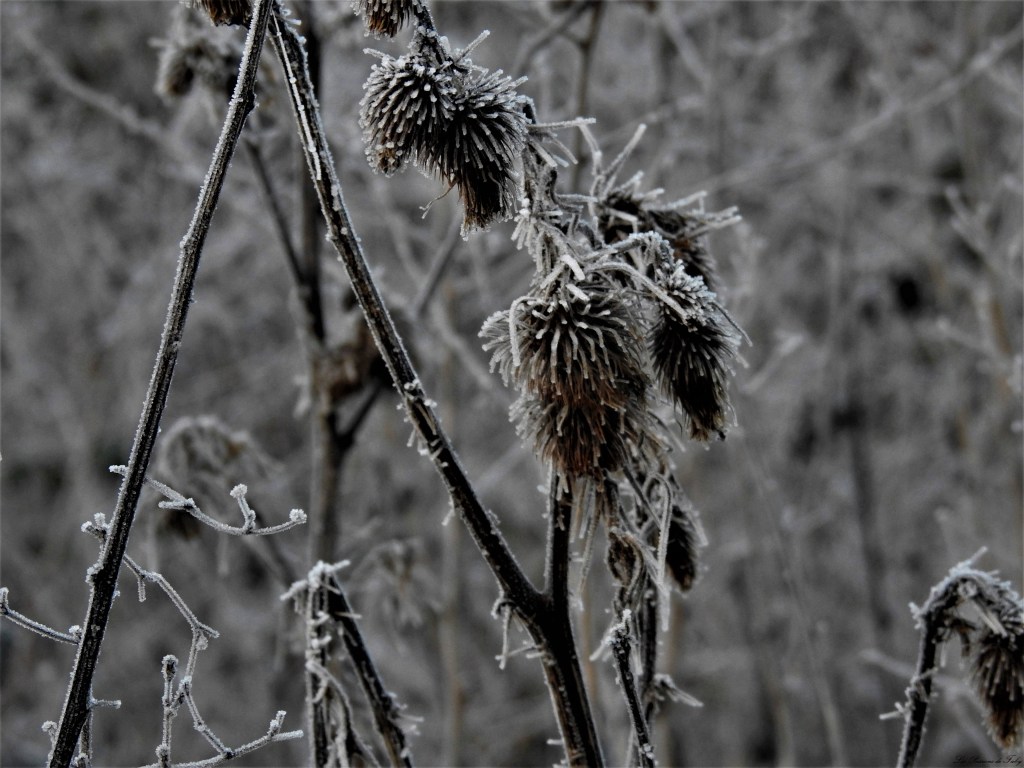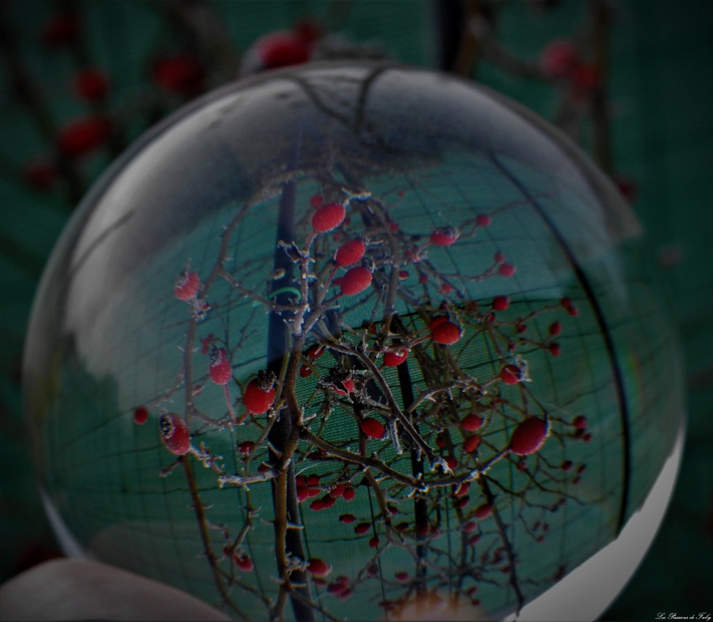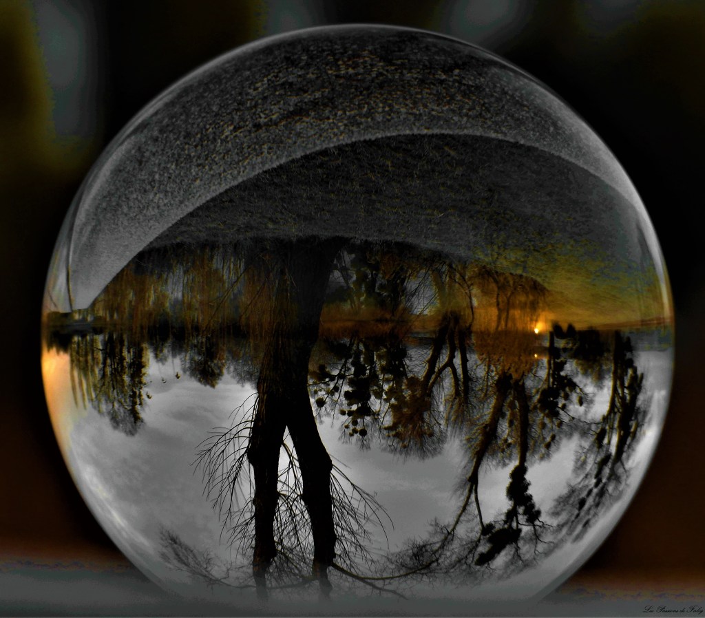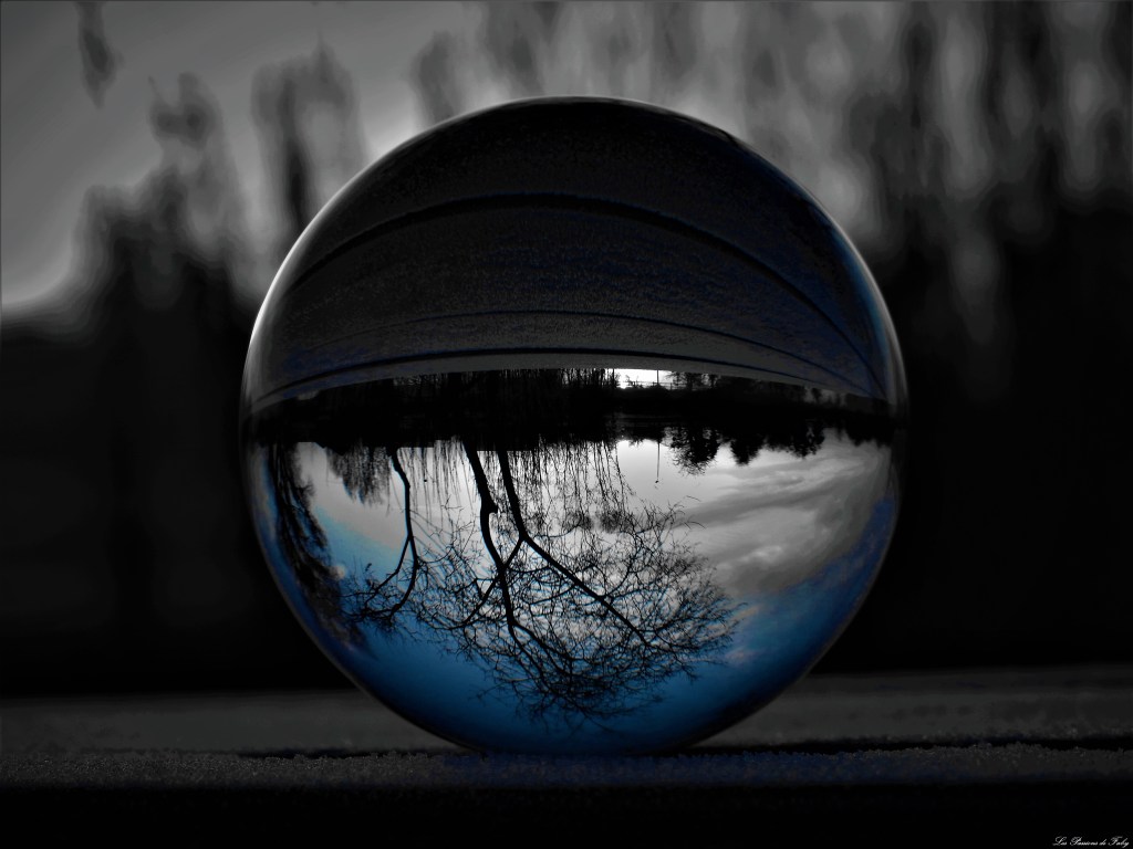 En me levant ce matin, j’ai vu qu’il avait gelé, c’était l’occasion de regarder le lever du soleil pas loin de l’étang et d’utiliser de nouveau ma Lensball.