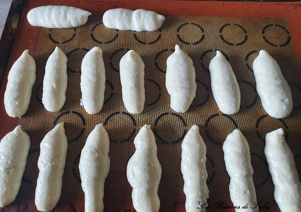 Verse le mélange dans une poche à douille unie (ou sans douille) et dresse des bâtonnets sur une plaque recouverte d’une feuille de papier cuisson (ou silicone, ou silpat®) Les bâtonnets sont censés avoir la même taille et le même gabarit (surtout si tu veux faire une charlotte, ça aide, je te conseille de dessiner au crayon de papier sur ta feuille de papier sulfurisé ton patron si comme moi tu n’es pas doué 😅) Si c’est pour déguster un café ou un thé, c’est pas trop grave . 😋😁