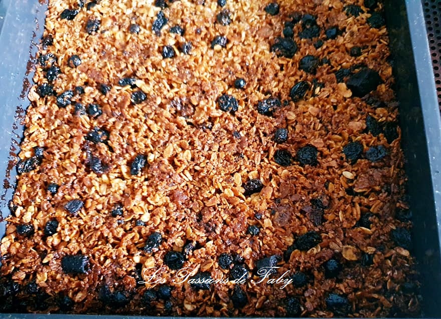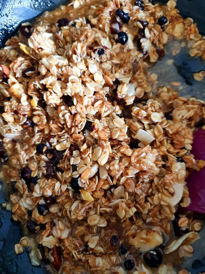 Hors du feu, ajouter les flocons d’avoine et les fruits secs, bien mélanger jusqu’à ce que les céréales soient bien imprégnées de crème caramel.
