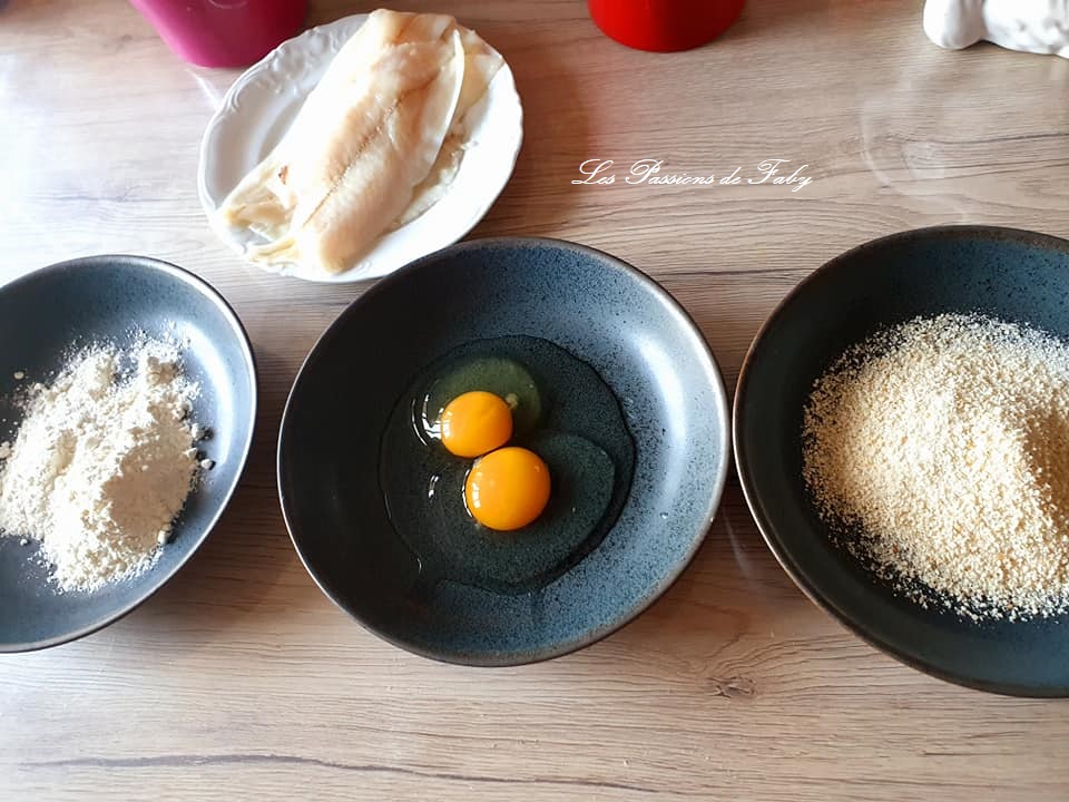 Prenez une lamelle de poisson et faites-la rouler dans la farine, plongez la ensuite dans les oeufs battus et enfin imbibez-la bien dans la chapelure. Mettre dans une assiette.