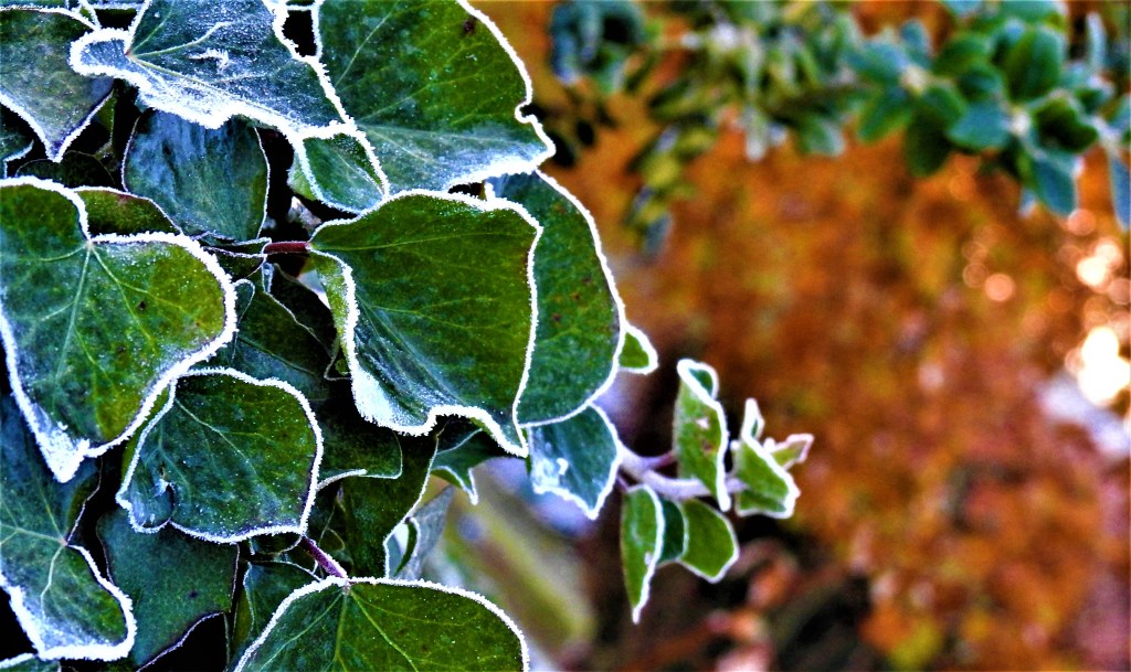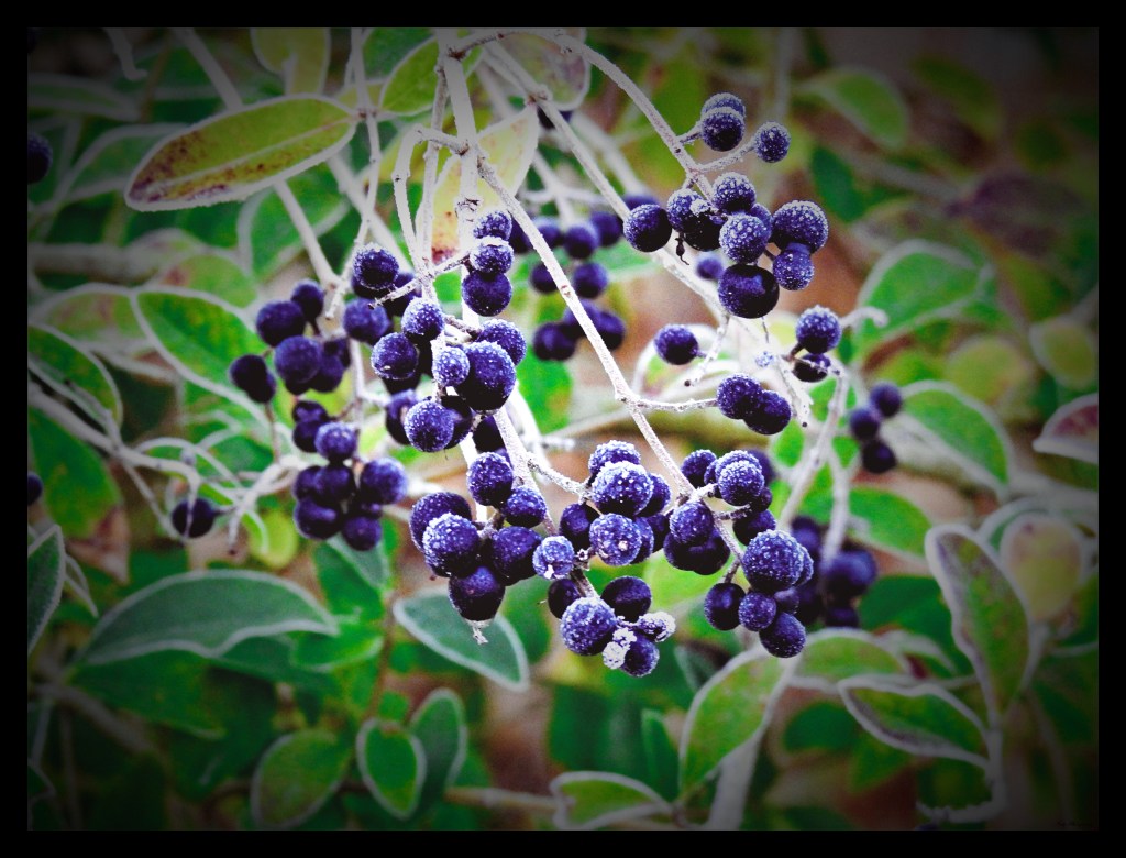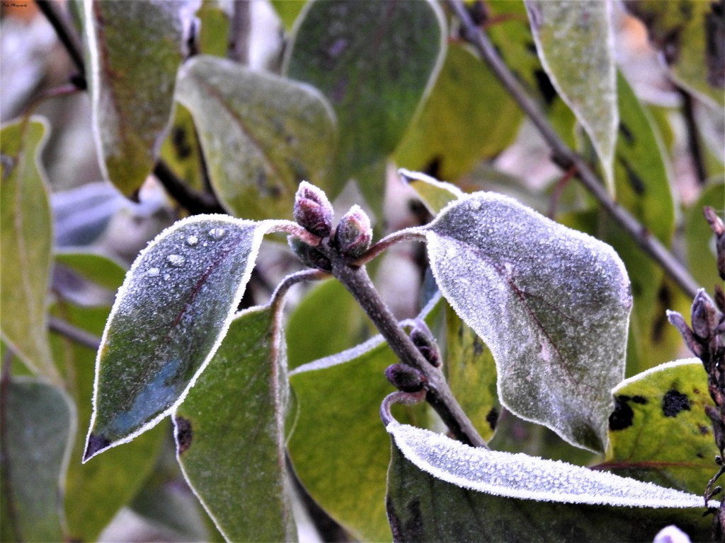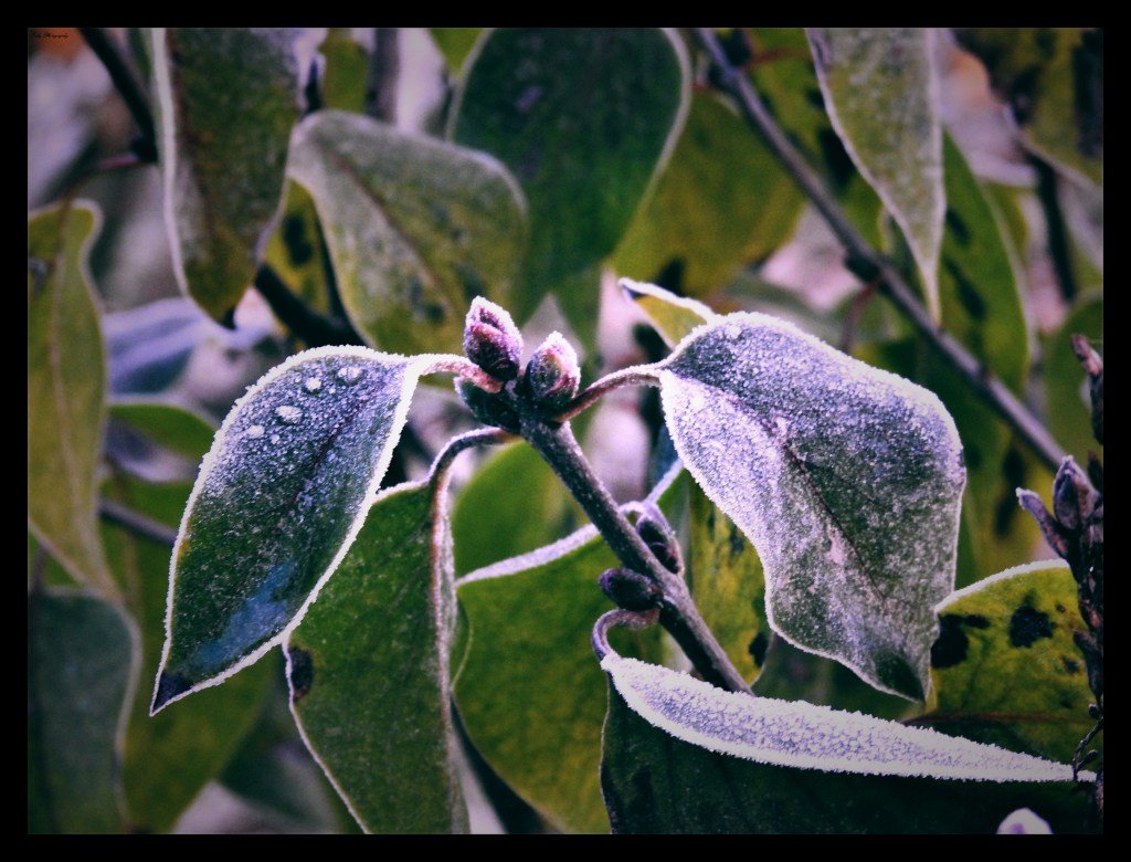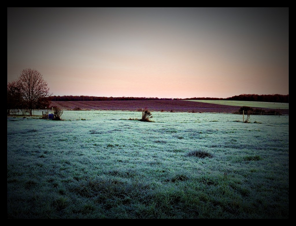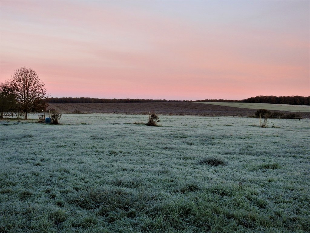 Il est un peu plus de 7h quand mes pas crissent sur le sol gelé, j’attends une lumière plus vive pour prendre des photos d’un monde givré, il fait froid, mes pieds sont déjà gelés, c’est alors que le lever du jour se colore d’un camaïeu de rouge au violet …