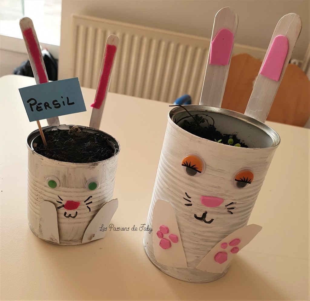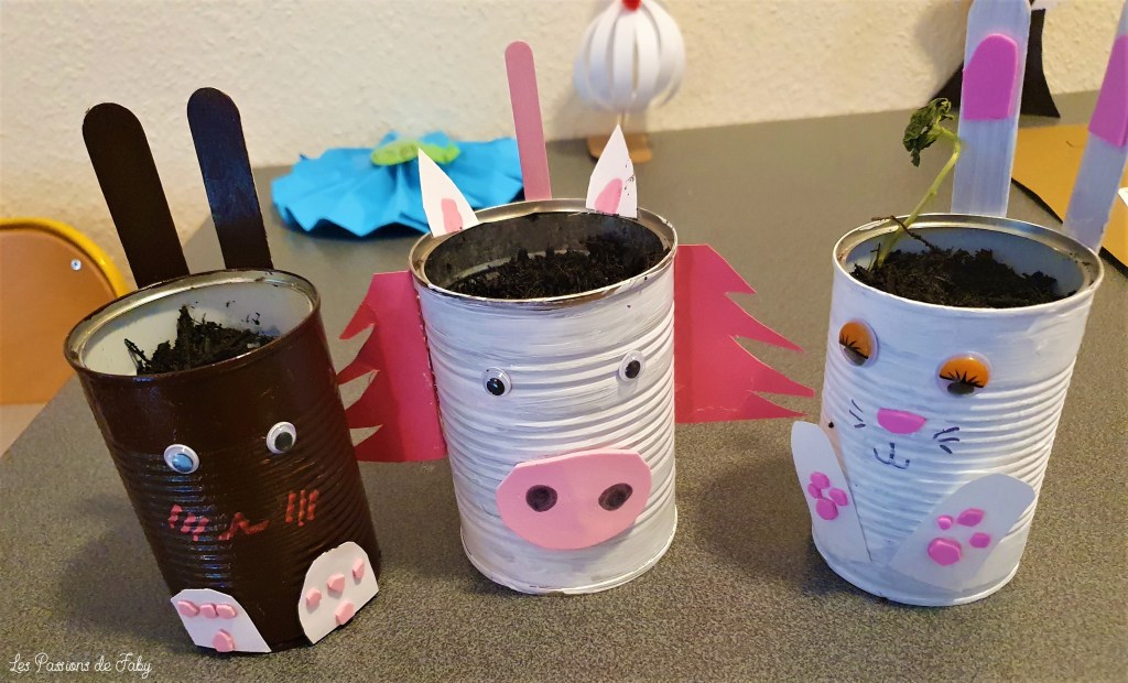 C’est tout simple à réaliser, on récupère des boîtes de conserves (perso comme je fais mes propres bocaux je n’en ai pas, j’ai donc sollicité les poubelles jaunes de tri sélectif chez mes voisins 😜), on les lave , on vérifie qu’il n’y a pas de bords coupants (si ce sont des boîtes décapsulables comme les cannettes de soda c’est l’idéal), on les décore , ici 2 couches de peinture acrylique ont été nécessaires. Pensez à faire le gabarit pour les pattes pour les plus jeunes. La colle chaude n’a servi que pour coller les bâtonnets en guise d’oreilles.