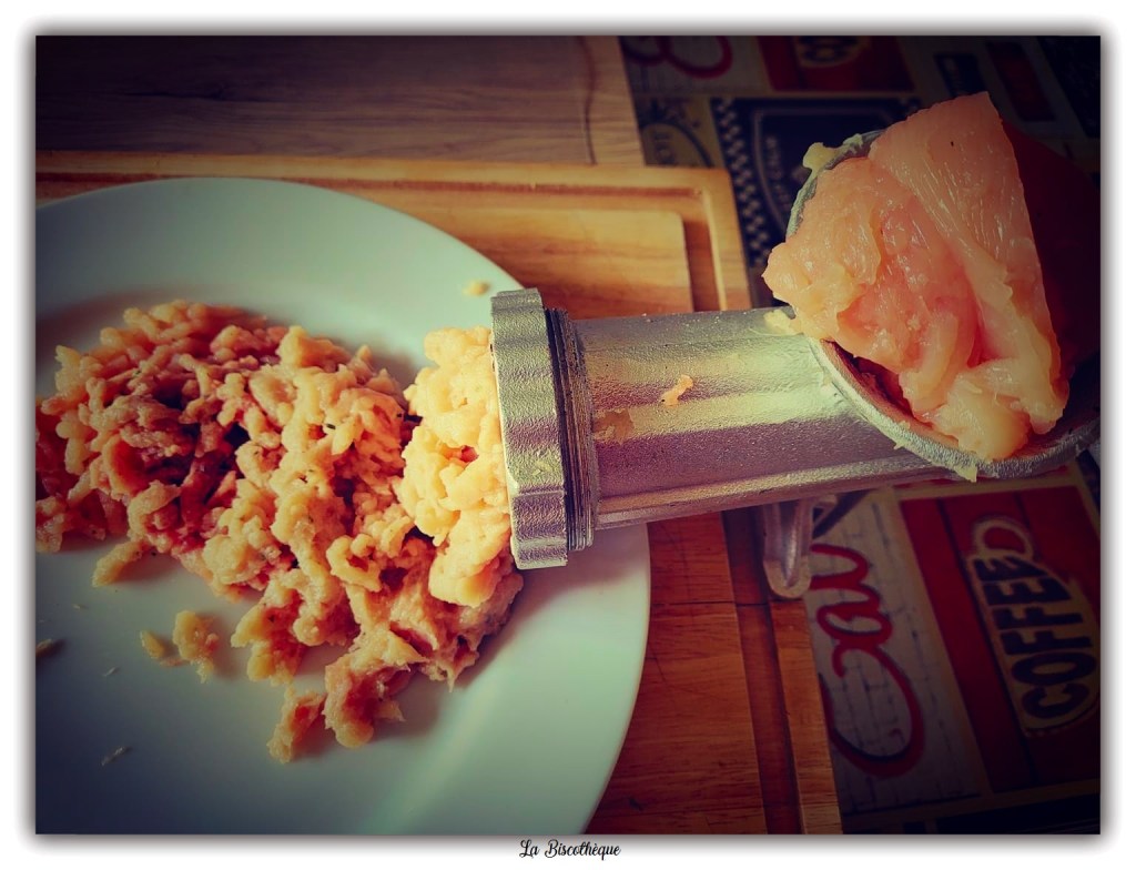 A l’aide d’un hachoir (manuel, traditionnel pour moi) , hacher le poulet, les échalotes, l’ail et le persil.