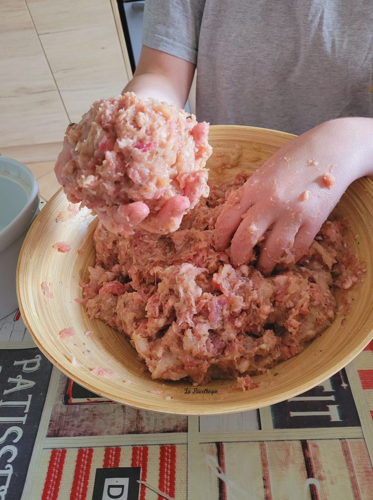 Dans une jatte (ou un saladier) mélanger à la main la viande hachée avec la chair à saucisse, les œufs (que tu auras cassé au préalable, hein?! 😜 ) , l’Armagnac (perso je je fais généralement au whisky mais là je n’en avais que du très bon et c’est dommage de le faire cuire) – 𝑆𝑖 𝑡𝑢 𝑣𝑒𝑢𝑥 𝑡𝑢 𝑝𝑒𝑢𝑥 𝑡’𝑎𝑢𝑡𝑜𝑟𝑖𝑠𝑒𝑟 𝑢𝑛𝑒 𝑝𝑒𝑡𝑖𝑡𝑒 𝑟𝑎𝑠𝑎𝑑𝑒 😁😝 , 𝑙𝑜𝑙 –