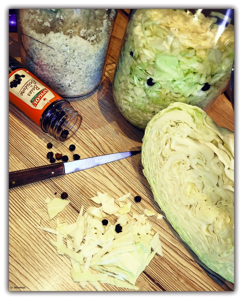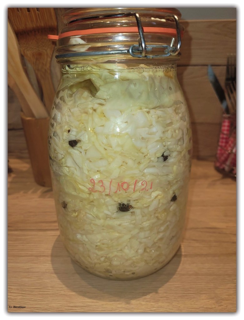 Aujourd’hui, j’ai toujours la jarre et le coupe-choux de mon enfance mais malheureusement je n’avais pas planté assez de choux dans mon potager cette année pour remplir le contenant.