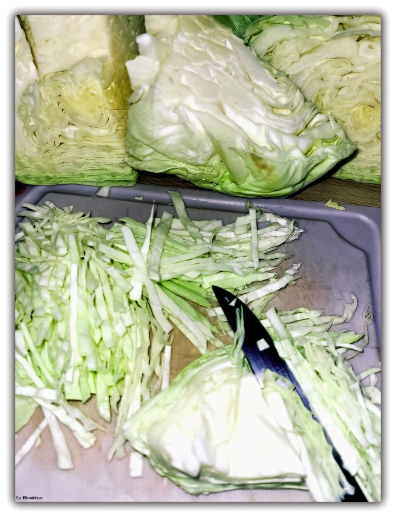 On a toujours l’impression que c’est très compliqué que ça prend un temps infini (en fait tu verras que ça ne prend pas trop de temps, il te faudra juste un peu de patience 😉) , je voyais ma grand-mère faire et dans mes yeux de fillette il est vrai que c’était laborieux car elle faisait d’immenses quantités dans sa jarre en terre cuite de 25 litres et être obligée d’utiliser le coupe-choux manuel n’était pas si amusant qu’elle le préconisait alors que j’avais des livres qui n’attendaient qu’à être dévorés 😁