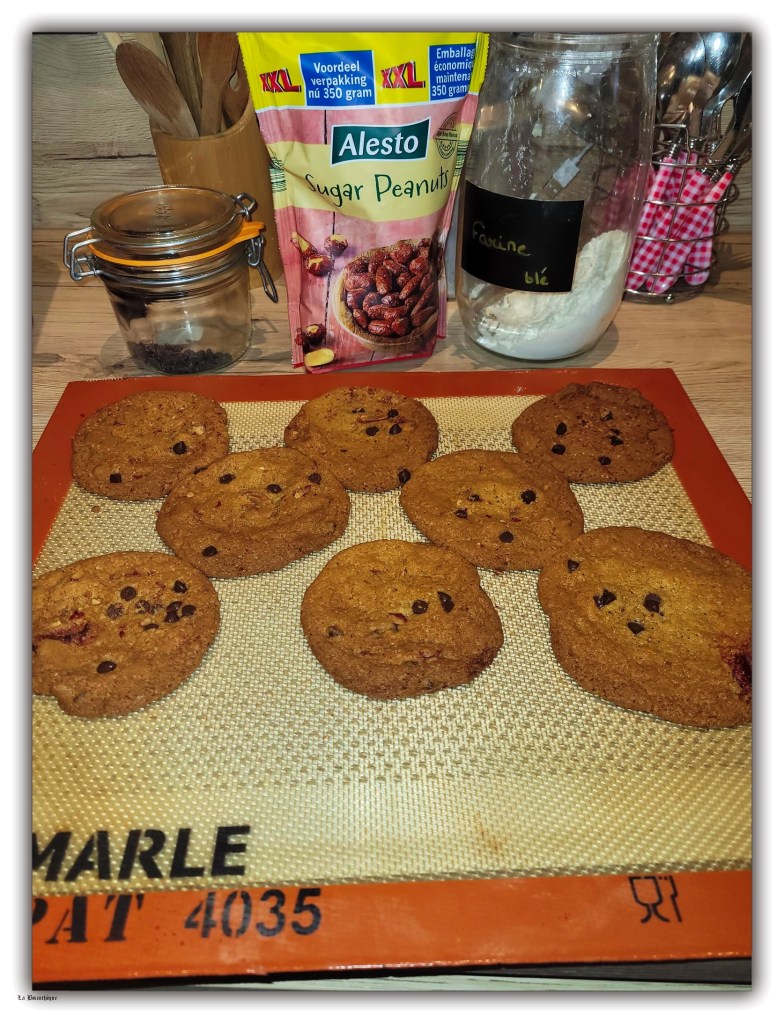 Aujourd’hui je te donne la recette de cookies aux pĂ©pites de chocolat et aux chouchous (tu sais ces cacahuĂštes bien sucrĂ©es et enrobĂ©es de caramel que tu trouves sur les plages, les fĂȘtes foraines ou depuis un certain temps maintenant dans les supermarchĂ©s , ici chez Lidl)