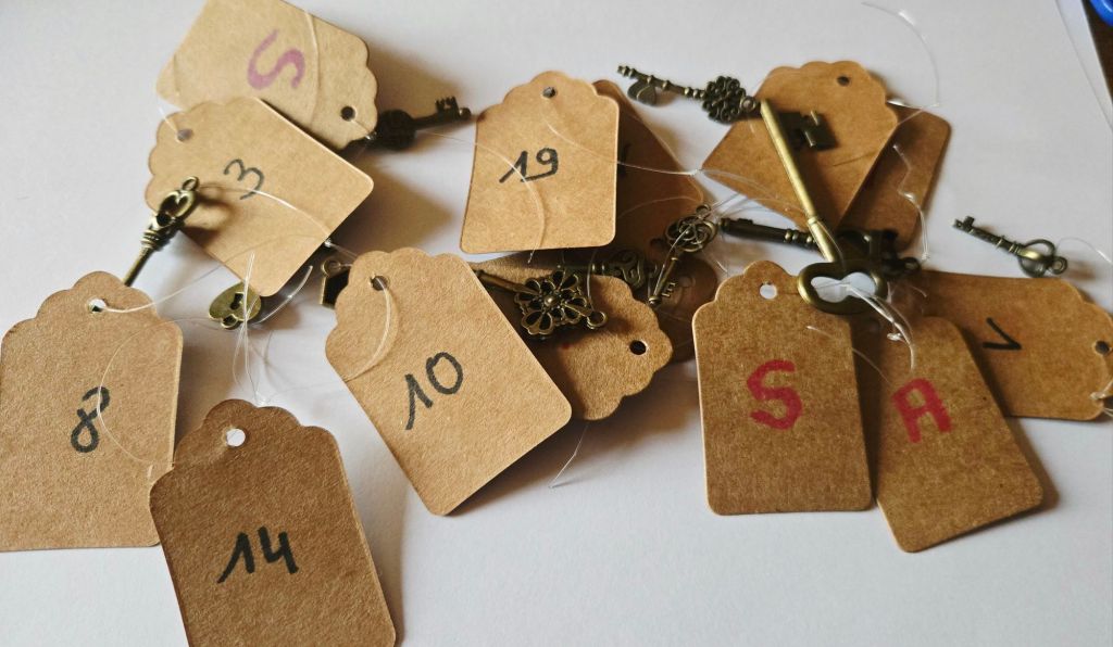 Mais il faut aussi que tu aies des petites clefs à ta disposition. (ou des grosses 😁, la première fois que j’ai fait ce petit jeu, il y a fort fort longtemps, j’avais récupéré toutes sortes de clefs: le double de la boîte aux lettre [ que j’ai perdu après ça 🤣🤣] , la clef de l’ancienne porte de grange, la clef des portes de la cuisine et de la salle à manger qu’on ne fermait jamais et de vieilles clefs dénichées pour 2€ en brocante… )