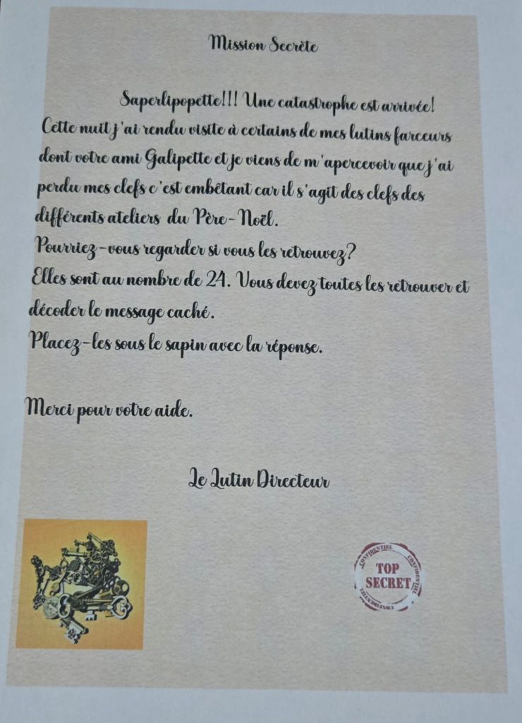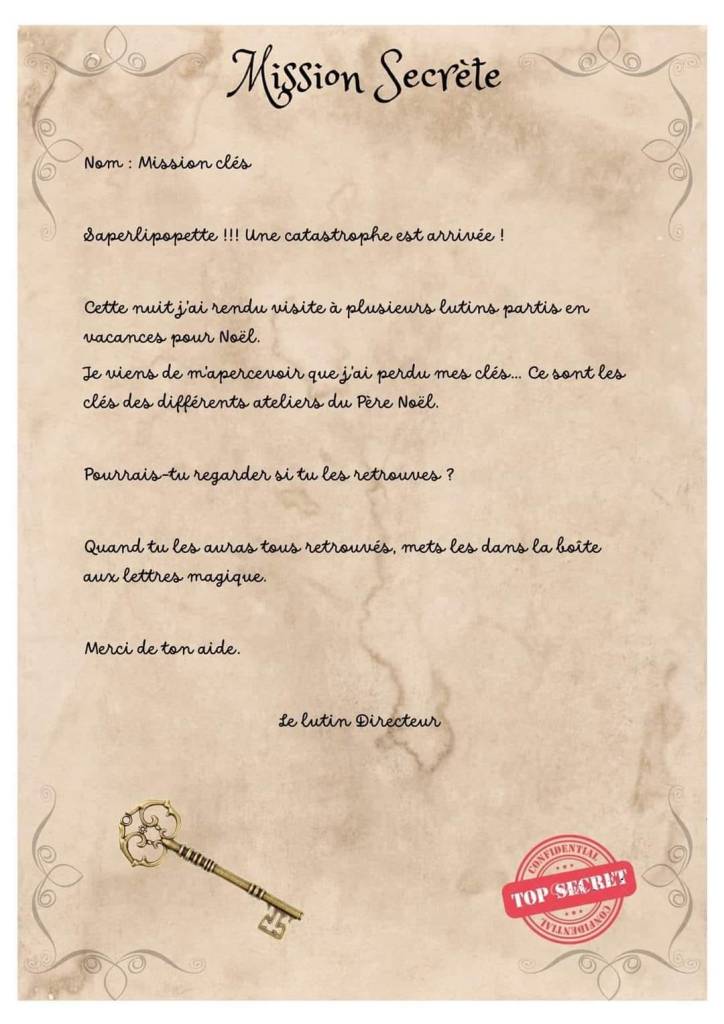 Le directeur des lutins a perdu les clefs de l’atelier du Père-Noël, ta mission est de les retrouver avant le 24 décembre minuit, afin que le Père-Noël puisse récupérer les cadeaux, les mettre sur le traîneau et débuter sa tournée.