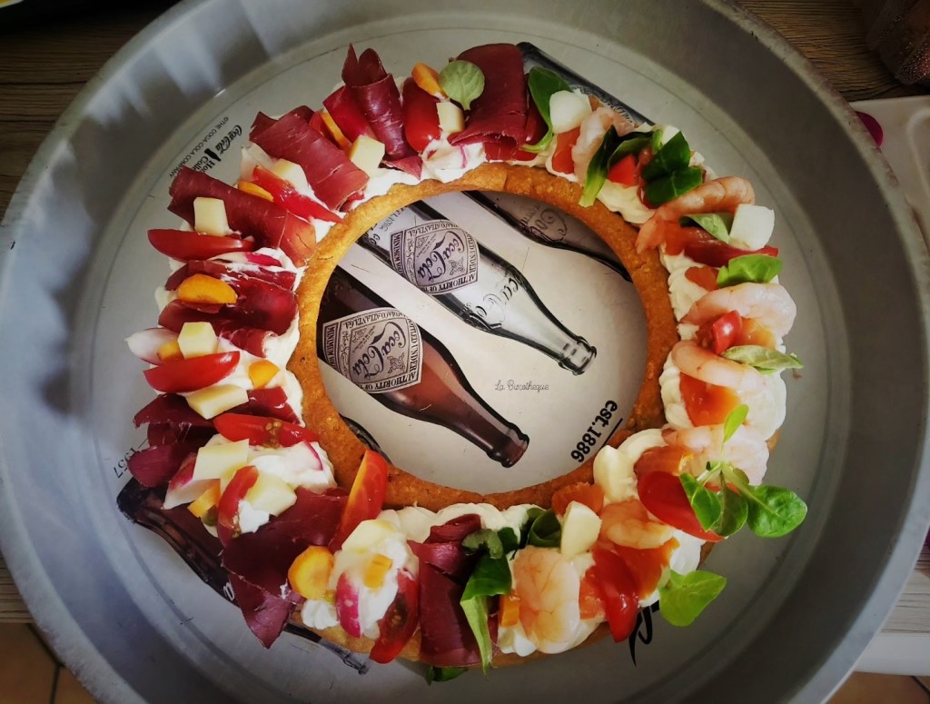 Etaler la pâte dans un moule à tarte ou autre, moi j’ai utilisé un moule à savarin car on peut couper de petites portions apéritives bien sympa et comme sur la photo, créer un dip sauce au milieu et rajouter des légumes frais, morceaux de fromage, de la charcuterie ou des nachos en plus tout autour.