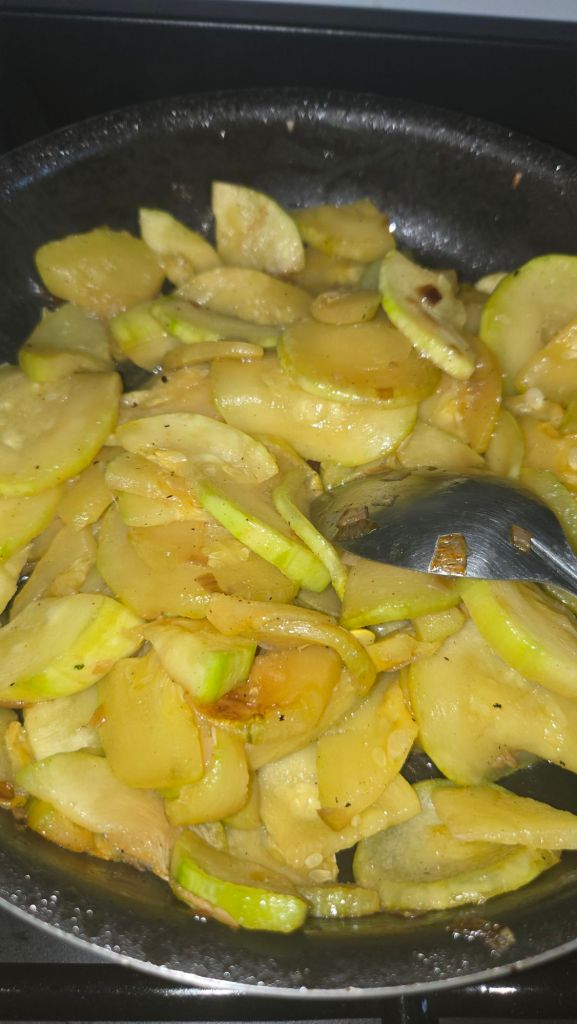 Dans une poêle (J’ai gardé la même que pour le saumon) fais revenir les échalotes et la courgette dans un filet d’huile d’olive jusqu’à ce les courgettes soient tendres