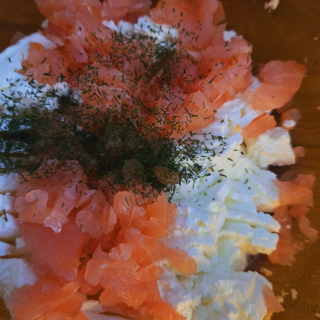 Découper 2 tranches de saumon en petits morceaux, verser dans un bol et mélanger avec le fromage frais, ajouter l’aneth finement ciselé . Bien mélanger de nouveau.
