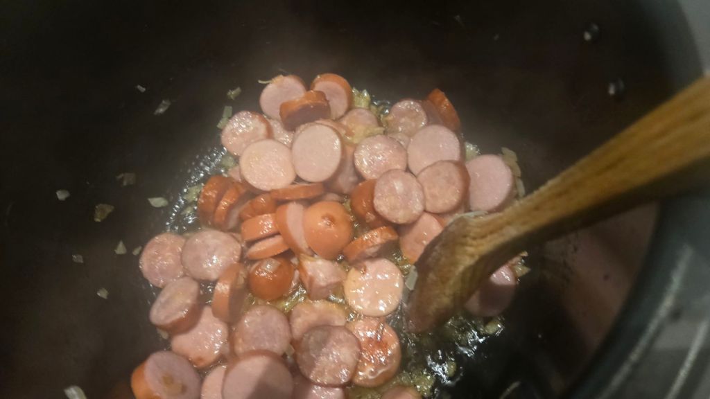 Dans la cuve du cookéo, en mode « dorer » verser l’huile d’olive , faire revenir l’oignon émincé puis rajouter les rondelles de saucisses. Laisser dorer quelques minutes.