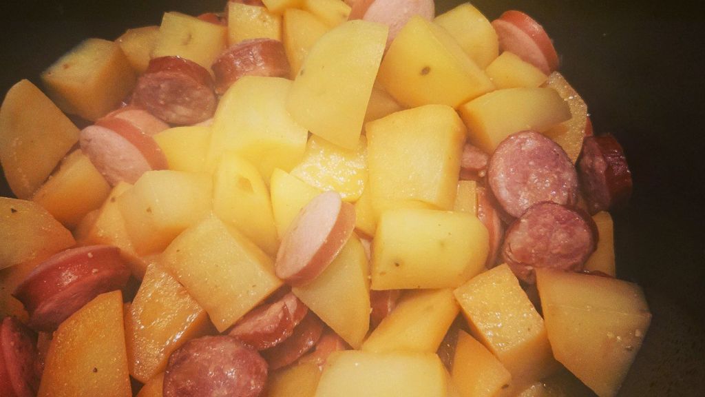 Rajouter les pommes de terre, le sel, le poivre et l’ail. Et mélanger le tout afin que les pommes de terre s’imprègnent de toutes les saveurs.
