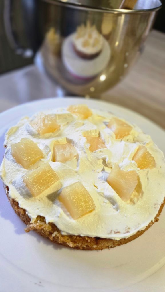 Au dessus de la base de la génoise, mettre une couche de crème puis des morceaux d’ananas par dessus.